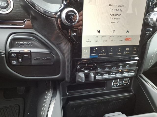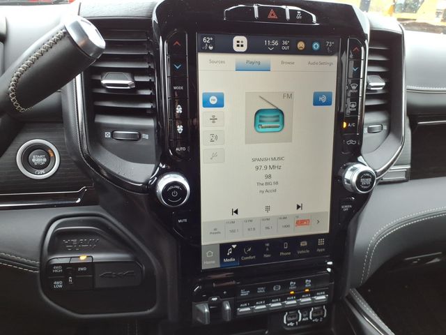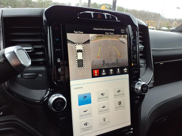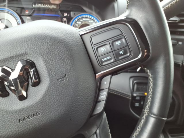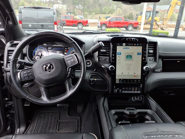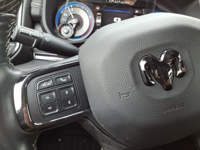 10 Speakers, 12" Touchscreen Display, 220 Amp Alternator, 3.73 Axle Ratio, 4-Wheel Disc Brakes, 4G LTE Wi-Fi Hot Spot, 5th Wheel/Gooseneck Towing Prep Group, ABS brakes, Active Noise Control System, Adaptive Steering System, Adjustable pedals, Air Conditioning, Air Suspension Decal, Alloy wheels, AM/FM radio: SiriusXM with 360L, Anti-Spin Differential Rear Axle, Apple CarPlay, Apple CarPlay/Android Auto, Audio memory, Auto High-beam Headlights, Auto Level Rear Air Suspension, Auto-dimming Rear-View mirror, Automatic temperature control, Black Exterior Mirrors, Black Exterior Truck Badging, Black Headlamp Bezels, Black Limited Grille, Black RAM Head Tailgate Badge, Black Tail Lamp Bezels, Black Wheel Center Hub, Body Color Door Handles, Body Color Grille Surround, Bodyside moldings, Brake assist, Bumpers: chrome, Center Stop Lamp w/Cargo View Camera, Clearance Lamps, Cold Weather Group, Compass, Connected Travel & Traffic Services, Connectivity - US/Canada, Dash Pass Thru Wire Circuits, Delay-off headlights, Disassociated Touchscreen Display, Driver door bin, Driver vanity mirror, Dual front impact airbags, Dual front side impact airbags, Electronic Stability Control, Electronically Controlled Throttle, Engine Block Heater, Exterior Mirrors Courtesy Lamps, Exterior Mirrors w/Heating Element, Exterior Mirrors w/Memory, Exterior Mirrors w/Supplemental Signals, Front anti-roll bar, Front Bucket Seats, Front Center Armrest w/Storage, Front dual zone A/C, Front fog lights, Front reading lights, Fully automatic headlights, Garage door transmitter, Genuine wood console insert, Genuine wood dashboard insert, Genuine wood door panel insert, Global Telematics Box Module (TBM), Google Android Auto, GPS Antenna Input, GPS Navigation, HD Radio, Heated door mirrors, Heated front seats, Heated rear seats, Heated steering wheel, I/P Mounted Auxiliary Switches, Illuminated entry, Integrated Voice Command w/Bluetooth, Leather steering wheel, Limited Leather Bucket Seats, Low tire pressure warning, Memory seat, Mirror Running Lights, Mirror-Mounted Aux Reverse Lamps, MOPAR Deployable Bed Step, MOPAR Winter Front Grille Cover, Navigation System, Night Edition, Occupant sensing airbag, Off-Road Information Pages, Outside temperature display, Overhead airbag, Overhead console, Painted Front Bumper, Painted Rear Bumper, Panic alarm, ParkView Rear Back-Up Camera, Passenger door bin, Passenger vanity mirror, Pedal memory, Pickup Box, Power Adjustable Convex Aux Mirrors, Power door mirrors, Power driver seat, Power passenger seat, Power steering, Power windows, Power-Folding Mir