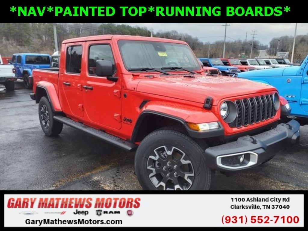 Firecracker Red Clearcoat 2025 Jeep Gladiator Sport 4WD 8-Speed Automatic 3.6L V6 24V VVT Bluetooth, Navigation System/ GPS, iPod Adapter, Heated Seats, Remote Start, Rear View Camera/ Backup Camera, Satellite Radio/ XM, Leather Seats, Tow Package, 4WD, UConnect, Apple Car Play, Alloy Wheels, Aluminum Wheels, 110 MPH Vehicle Max Speed Calibration, 115V Auxiliary Power Outlet, 12.3" Touchscreen Display, 4-Wheel Disc Brakes, 4.10 Rear Axle Ratio, 400W Inverter, 4G LTE Wi-Fi Hot Spot, 8 Speakers, ABS brakes, Advanced Brake Assist, Air Conditioning, Alexa Built-In, Alpine Premium Audio System, AM/FM radio: SiriusXM, Anti-Spin Differential Rear Axle, Apple CarPlay, Apple CarPlay/Android Auto, Auto-Dimming Rear-View Mirror, Automatic Headlamps, Auxiliary Switches, Black Molded-In-Color Fender Flares (2-Piece), Bluetooth Wireless Speaker, Body Color 3-Piece Hard Top, Brake assist, Class IV Receiver Hitch, Cloth Low-Back Bucket Seats, Compass, Connected Travel & Traffic Services, Connectivity - US/Canada, Convenience Group, Conventional Differential Front Axle, Corning Gorilla Glass, Dana M210 Wide Front Axle, Dana M220 Wide Rear Axle, Daytime Running Lamp System, Deep Tint Sunscreen Windows, Delay-off headlights, Driver door bin, Driver vanity mirror, Dual front impact airbags, Dual front side impact airbags, Electronic Stability Control, Emergency/Assistance Call, Enhanced Adaptive Cruise Control, Freedom Panel Storage Bag, Front anti-roll bar, Front Bucket Seats, Front Center Armrest w/Storage, Front Door Locks 2-Door Passive Entry, Front fog lights, Front reading lights, Full Speed Forward Collision Warning Plus, Google Android Auto, GPS Antenna Input, GPS Navigation, HD Radio, Heated Front Seats, Heated Steering Wheel, Heavy-Duty Engine Cooling, Illuminated entry, Integrated Center Stack Radio, Integrated roll-over protection, Integrated Voice Command w/Bluetooth, Low tire pressure warning, Max Tow Package w/4.10 Axle Ratio, Media Hub w/2 Charge Only USBs, Mopar Black Tubular Side Steps, MOPAR Spray In Bedliner, No Soft Top, Normal Duty Plus Suspension, Normal Duty Suspension, Occupant sensing airbag, Outside temperature display, Overhead airbag, Panic alarm, ParkView Rear Back-Up Camera, Passenger door bin, Passenger vanity mirror, Power Heated Mirrors, Power steering, Power windows, Premium McKinley Trimmed Seats, Premium Package, Premium Wrapped Steering Wheel, Quick Order Package 24S Sport S, Radio data system, Radio: Uconnect 5 Nav w/12.3" Display, Radio: Uconnect 5 w/12.3" Display, Rear anti-roll bar, Rear reading lights, Rear Sliding Window, Rear Window Defroster, Remote keyless entry, Remote Start System, Security Alarm, SiriusXM Radio Service, SiriusXM w/360L, Speed control, Split folding rear seat, Steering wheel mounted audio controls, Sun Visors w/Illuminated Vanity Mirrors, Tachometer, Technology Group, Telescoping steering wheel, Tilt steering wheel, Traction control, Trailer Hitch Zoom, Trailer Tow & Aux Switch Group, Trip computer, Universal Garage Door Opener, USB Host Flip, Variably intermittent wipers, Voltmeter, Wheels: 17" x 7.5" Black Steel Styled, Wheels: 17" x 7.5" Gray, Wheels: 18" x 7.5" Machined/Painted Gray, 110 MPH Vehicle Max Speed Calibration, 115V Auxiliary Power Outlet, 12.3" Touchscreen Display, 4-Wheel Disc Brakes, 4.10 Rear Axle Ratio, 400W Inverter, 4G LTE Wi-Fi Hot Spot, 8 Speakers, ABS brakes, Advanced Brake Assist, Air Conditioning, Alexa Built-In, Alpine Premium Audio System, AM/FM radio: SiriusXM, Anti-Spin Differential Rear Axle, Apple CarPlay, Apple CarPlay/Android Auto, Auto-Dimming Rear-View Mirror, Automatic Headlamps, Auxiliary Switches, Black Molded-In-Color Fender Flares (2-Piece), Bluetooth Wireless Speaker, Body Color 3-Piece Hard Top, Brake assist, Class IV Receiver Hitch, Cloth Low-Back Bucket Seats, Compass, Connected Travel & Traffic Services, Connectivity - US/Canada, Convenience Group, Conventional Differential Front Axl Price includes: $2250 - 2025 National Bonus Cash