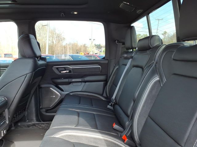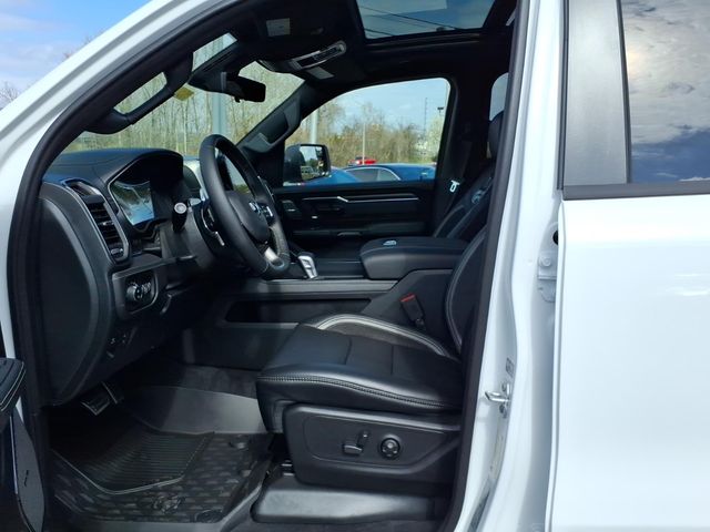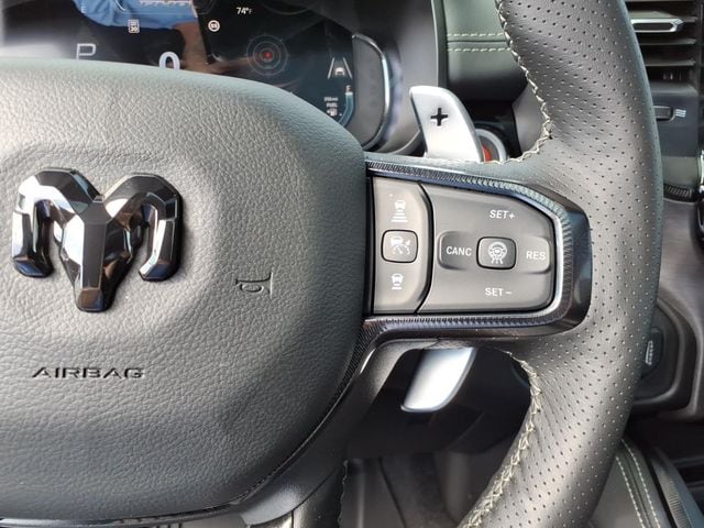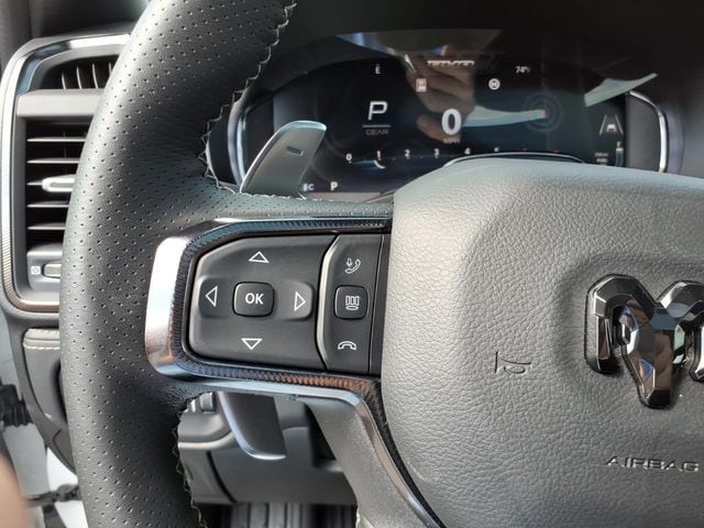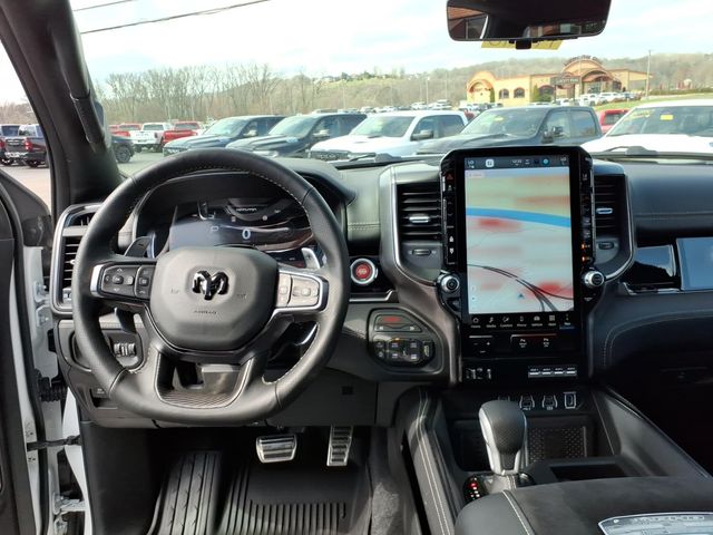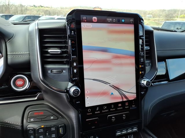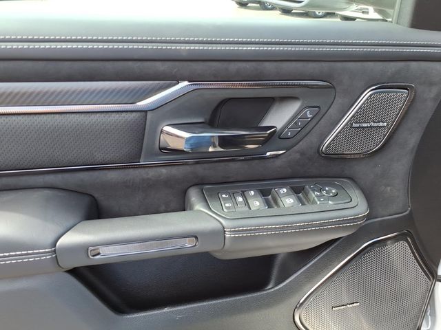 10 Speakers, 12-Way/1-Way Trailer Connector, 14.4" Touchscreen Display, 240 Amp Alternator, 3.92 Rear Axle Ratio, 4-Wheel Disc Brakes, 4G LTE Wi-Fi Hot Spot, ABS brakes, Adaptive suspension, Adjustable pedals, Air Conditioning, Alloy wheels, AM/FM radio, Apple CarPlay/Android Auto, Auto High-beam Headlights, Auto Power-Folding Mirrors, Auto-dimming door mirrors, Auto-Dimming Exterior Driver Mirror, Auto-dimming Rear-View mirror, Automatic temperature control, Brake assist, Compass, Connected Travel and Traffic Services, Connectivity - US/Canada, Delay-off headlights, Disassociated Touchscreen Display, Dome Dual LED Reading Lamp, Driver door bin, Driver Power Seat Back Massage, Driver Seat Memory, Driver vanity mirror, Driver/Passenger Wrapped Assist Handles, Drowsy Driver Detection, Dual front impact airbags, Dual front side impact airbags, Dual Wireless Charging Pad, Dual-Pane Panoramic Sunroof, Electronic Stability Control, Engine Block Heater, Evasive Steer Assist, Exterior Mirrors Courtesy Lamps, Exterior Mirrors with Heating Element, Exterior Mirrors with Memory, Exterior Mirrors with Supplemental Signals, Exterior Parking Camera Rear, Flareside Box, Front anti-roll bar, Front Bucket Seats, Front Center Armrest w/Storage, Front dual zone A/C, Front fog lights, Front Passenger Interactive Display, Front Passenger Power Seat Back Massage, Front reading lights, Front wheel independent suspension, Full Length Premium Upgraded Floor Console, Fully automatic headlights, Garage door transmitter, GPS Navigation, Hands-Free Active Driving Assist System, Harman/Kardon 19 Speaker Premium Sound, HD Radio, Heads-Up Display, Heated door mirrors, Heated front seats, Heated Second Row Seats, Heated steering wheel, Illuminated entry, Integrated Center Stack Radio, Integrated Voice Command with Bluetooth, Intersection Collision Assist System, Leather Shift Knob, Leather steering wheel, Leather Trimmed Bucket Seats, Leather/Carbon Flat-Bottom Steering Wheel, LED CHMSL Lamp, Low tire pressure warning, Luxury Front Door Trim Panel, Manufacturer's Statement of Origin, Navigation System, Occupant sensing airbag, Outside temperature display, Overhead airbag, Overhead console, Panic alarm, Passenger door bin, Passenger vanity mirror, Power Adjustable Pedals with Memory, Power door mirrors, Power driver seat, Power passenger seat, Power steering, Power Tailgate, Power windows, Premium Wrapped Instrument Panel Bezel, Quick Order Package 22Y RHO, Radio data system, Radio: Uconnect 5 Nav with 14.4" Display, Radio: Uconnect 5 Navigation with 12.0" Display, Radio/Driver Seat/Mirrors/Pedals Memory, Rain Sensitive Windshield Wipers, Real Carbon Fiber Interior Accents
